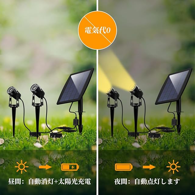 商品名:DINGLILED ソーラーライト 屋外 ガーデンライト スポットライト アウトドア led IP65防水 分離式 イルミネーション 暖色 埋め込み式 2灯 おしゃれ 電球色 明暗センサー 防犯 壁掛け ライトアップ 自動点灯消灯 明るい ソーラー 太陽光充電 防塵 庭 玄関 車道 歩道 景観