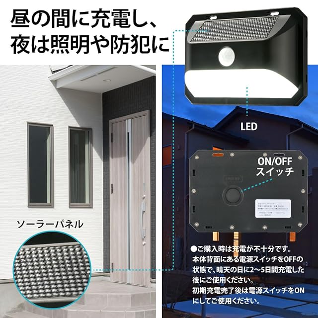 ≪ご注意≫※ ご購入時は充電が不十分です。本体背面にある電源スイッチをOFFの状態で、晴天の日に2~5日間充電した後にご使用ください。初期充電完了後は電源スイッチをONにしてご使用ください。