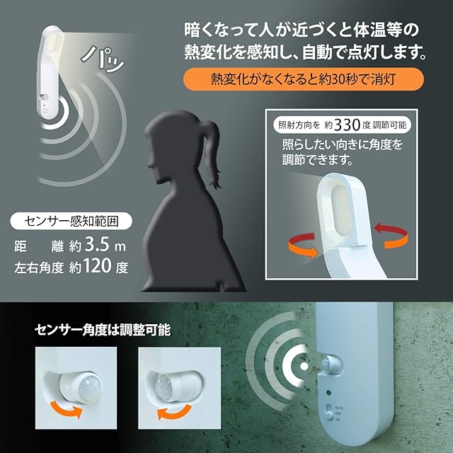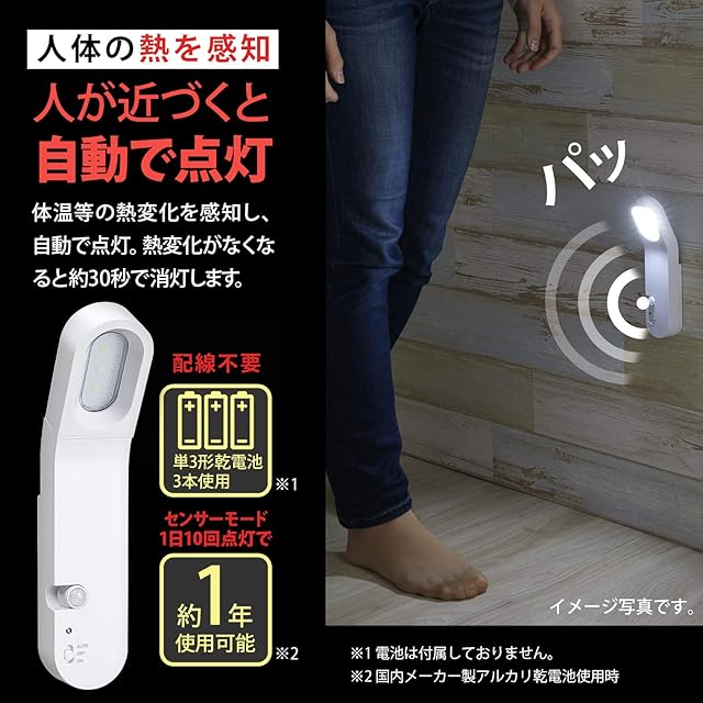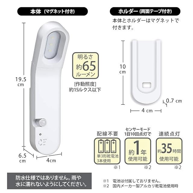 [使用電池]単3乾電池×3本(別売)/[使用光源]白色LED×3灯/[電池寿命]連続点灯(ON)時約35時間、センサーモード(AUTO)時約1年(1日10回点灯時)、(国内メーカー製アルカリ乾電池使用時)/[1回あたりの点灯時間(AUTO)]約30秒