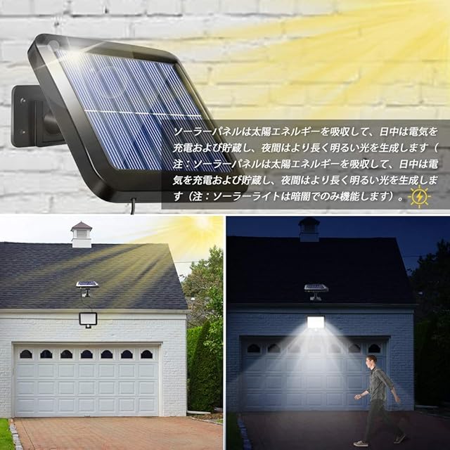 E.IP65防水性と耐熱性: ご注意ください、ソーラーパネルの上にライトを取り付けないでください。 人の動きを感知してライトが点灯し、 光源がソーラーパネルを照らすため、 ライトがちらつく原因になります。