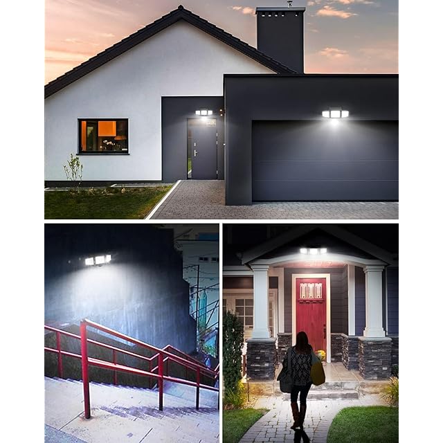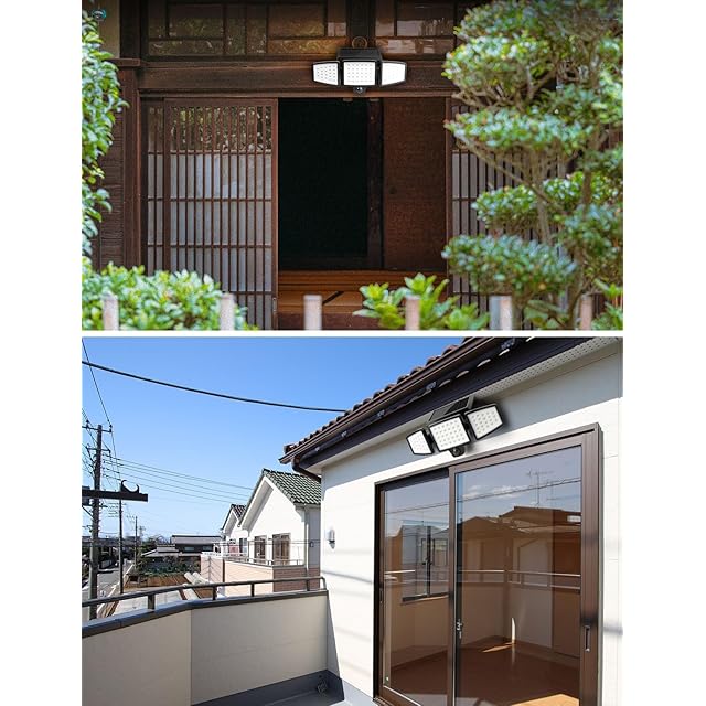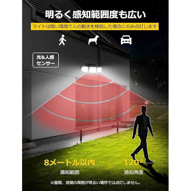 【人感・光センサー搭載&自動点灯・消灯】光センサーが搭載され、夜間になれば自動的に電源がオンになり、朝になると自動的にオフになります。また、人感センサーも搭載され、人や車の動きを感知するとライトは自動的に20秒間点灯します。玄関、駐車場、庭、階段、通路や家の周りの防犯など様々なシーンで大活躍します。