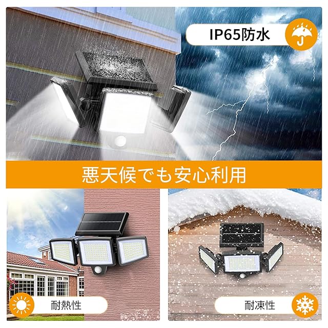 【IP65防水仕様・屋外にも適用】防水レベルはIP65なので、大雨の日でも安心してお使いいただけます。また、弊社のソーラーライトは耐久性のあるABS樹脂を採用し、耐熱や耐凍性に優れ、悪天候や悪環境においても心配はありません。玄関先やガレージの入り口に設置し、LED投光器として利用するのもおすすめ!