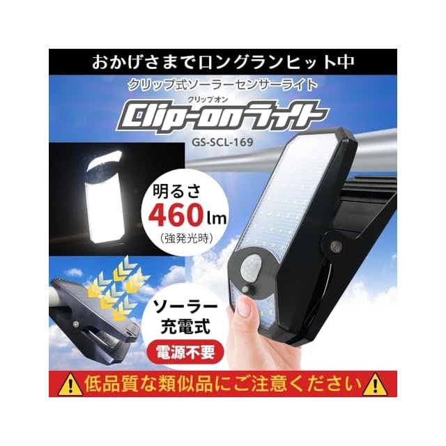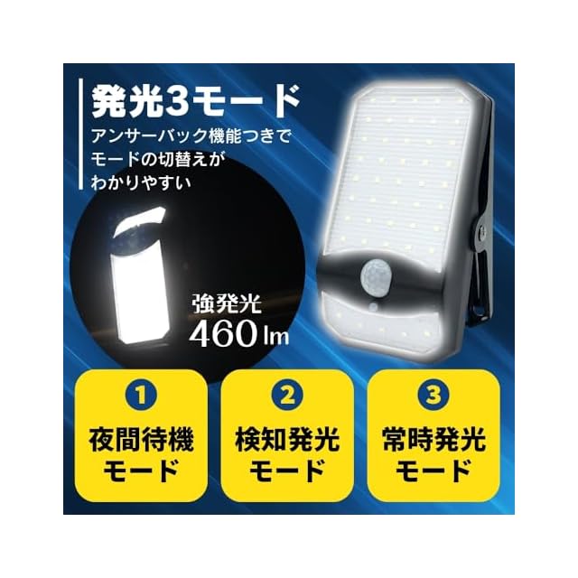 商品名:ソーラー センサーライト クリップオン クリップ式 (人感センサー / 460lm / 防水) ソーラーライトledライト 防犯ライト (屋外/コードレス/大容量バッテリー) キャンプ 防災 災害 簡単取り付け