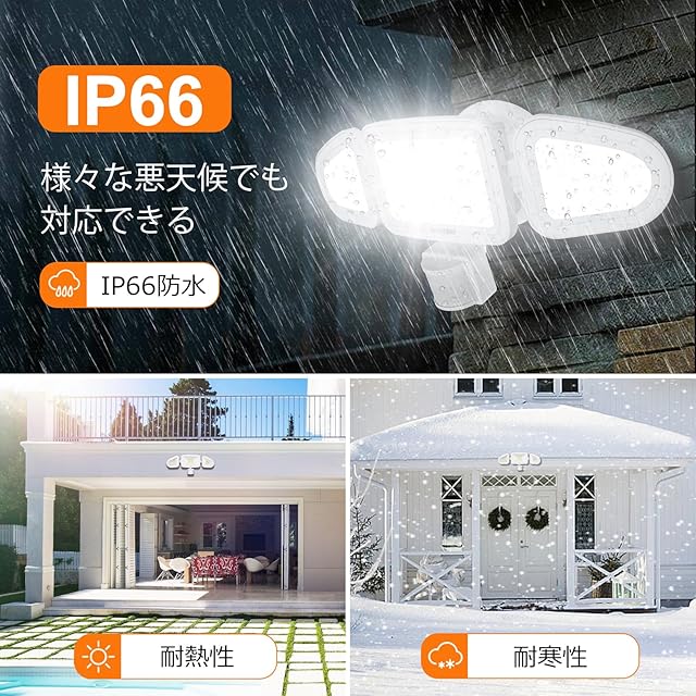 【IP66防水・屋外に設置可能】LEDセンサーライトはIP66防水防塵仕様で、悪天候でも耐えるように設計されています。センサー調整ノブには、雨水の浸入を防ぐための防水性のある柔らかいゴム製ストッパーが付いています。屋根のない場所、外からの雨にさらされるような場所に設置しても安心です。