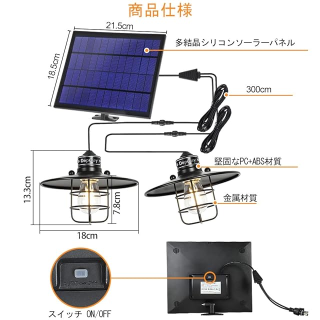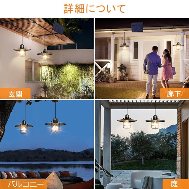 商品名:DINGLILED分離型2灯 LEDソーラーライトペンダントライト屋外 2000mAh電池容量 太陽光発電 センサーライト人感センサー 防犯ライト電球色 玄関灯 光センサー付き 夜間自動点灯 電気代不要 IP65防水 口金E26 玄関先/庭/駐車場/ガーデン等屋内外に適応(LED 電球付属)
