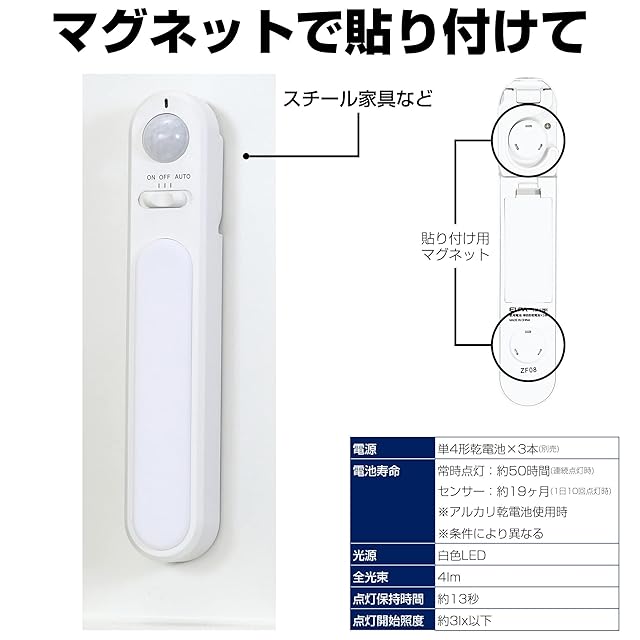 ■電池寿命:センサーモード/約19ヶ月(1日10回点灯時) 常時点灯モード/約50時間 ※アルカリ乾電池使用時 ※電池の性能、使用条件により電池寿命は短くなる場合があります。