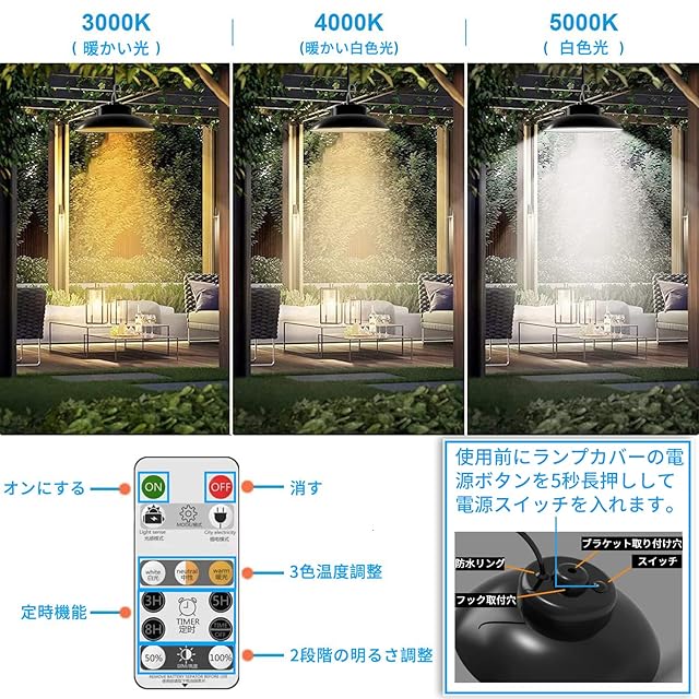 【3色温度切替・定時機能・两段階輝度調整】❶暖色(3000K)/温白色(4000K)/昼光色(6000K) を切替え可能。設置するとより雰囲気が出て、光の空間演出を楽しめます。❷点灯時間(3H/5H/8H)を選択できます。❸50%100%での2段階の明るさを調整することができます。(低輝度モード:連続照明14~16時間可能です;高輝度モード:連続照明8~10時間可能です)