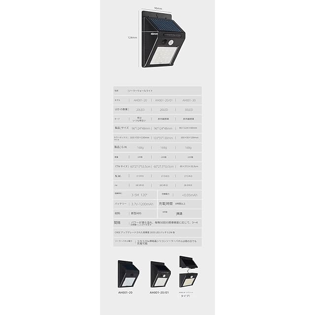 光色:6000K-6500K白色光 LED数:20LED ワット数:4W ソーラーパネルのワット数:0.65 W ソーラーパネル効率:17% LEDタイプ:2835 SMD ルーメン:460ルーメン 遅延時間:10秒 ナイトセンサー:10ルクス未満 手動スイッチモード:オフまたは自動 防水:IP65