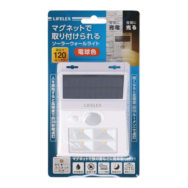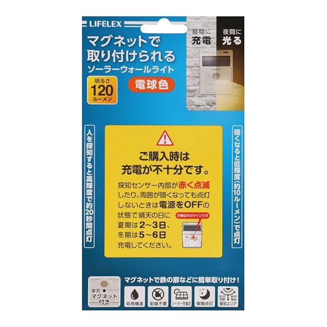 【仕様】●光源:LED0.5W×4個●点灯回数(高輝度時):約350回(満充電時)●探知方式:赤外線探知方式●点灯時間設定:約20秒●使用電源:リチウムイオン充電池1500mAh(電池交換不可)●ルーメン値:約120ルーメン(LED×4個)●設置場所:屋外(防雨構造 IPX5)●重量:約175g●サイズ(約):幅95×奥行50×高さ122mm●付属品:壁取り付け用ネジ2個、壁取り付け用スリープ2個
