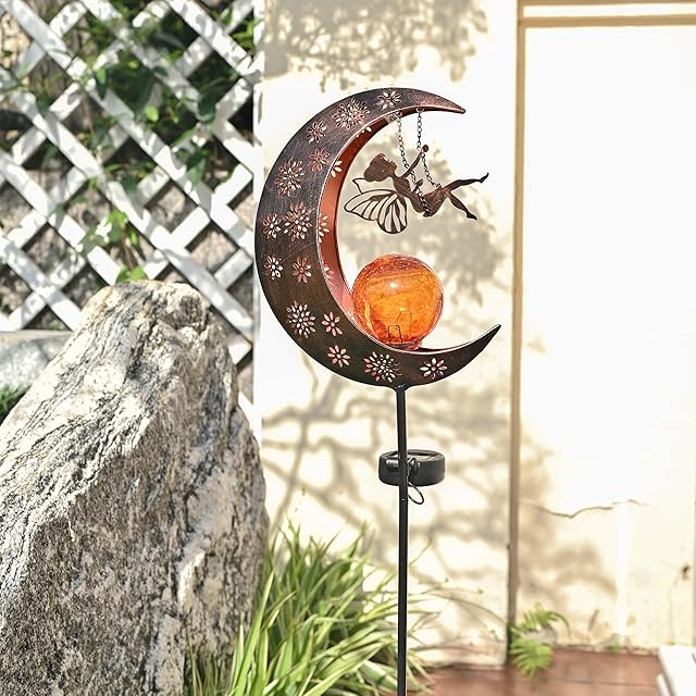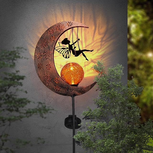【デザイン】メタル製の三日月型のガーデンオーナメントです。綺麗な妖精が月に座って、すぐにロマンチックな雰囲気がつくてくれます!ガーデン、玄関のアポローチに置いて、精巧な工芸品すぐに目が惹かれます!ガラスの電球は夜になると、暖かい光が発光します!