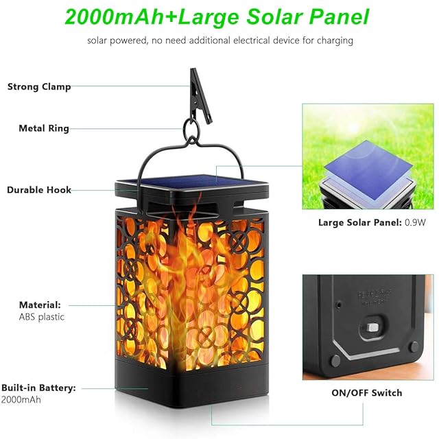 【ソーラーランタン】防錆仕上げの高品質の金属から作られ、耐久性があり、長年屋外で使用できます。 4つの側面はガラス効果のあるポリプラスチックから作られています。 もっと美しいちらつきの炎の効果を見えるのが現実です。 ご注意:使用前に下部のスイッチを「ON」の位置まで押してください。