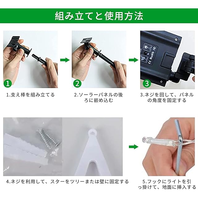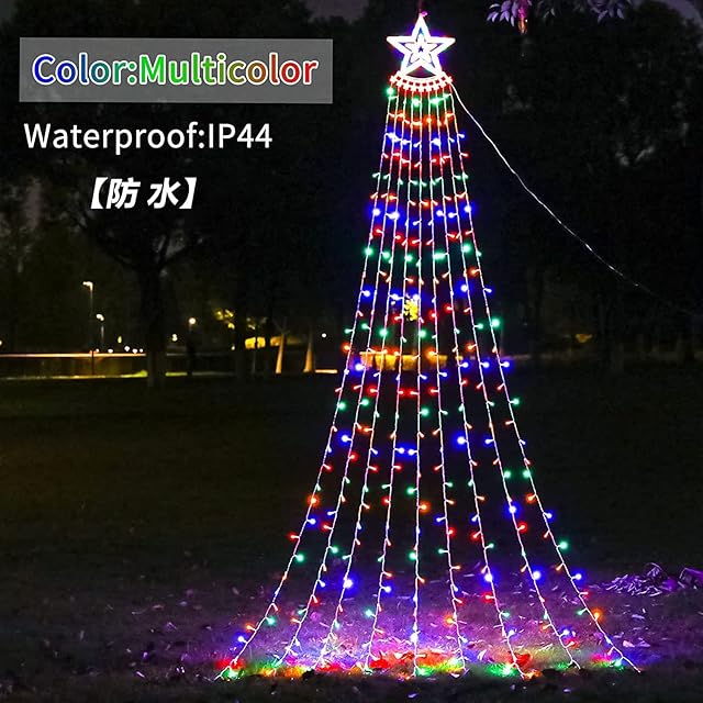 【ドレープライト仕様】LEDの数:350PCS球、一個の大きい星+9本のドレープライト、主な材質:PVC+銅線+ABS、電源:ソーラー充電、点灯パターン:8種類の点灯パタン、タイマー:タイムモード