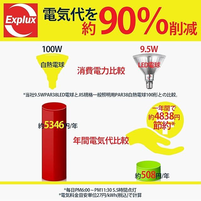 [高効率・省エネ] 僅か9.5Wの消費電力で、従来の白熱電球100W形相当の明るさを実現できる。1年間で約4838円を節約できる。