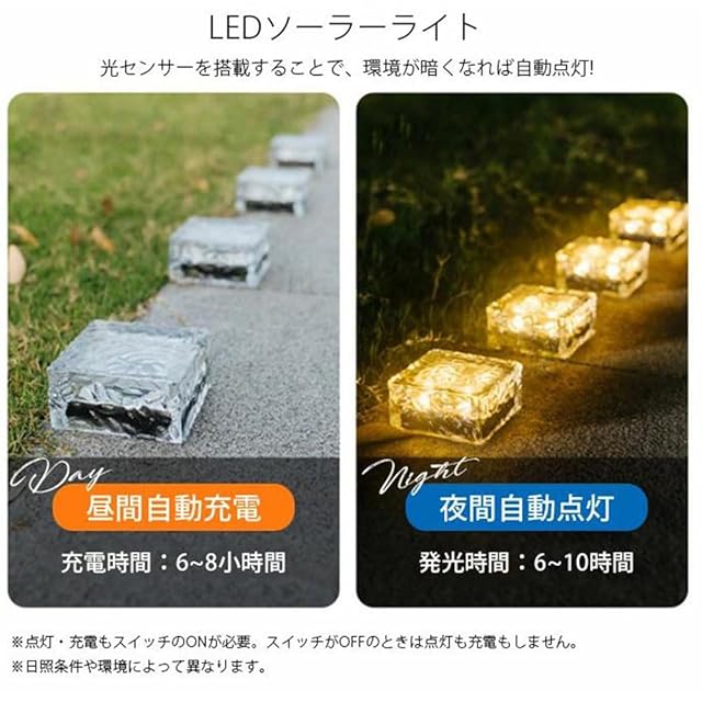「適用場所」:本製品は、さまざまな屋外空間で使用することができます。庭園、花壇、道路、通路、ガーデンパス、階段、プールサイドや池、いろんな場所でソーラーガーデンライトを設置することで、屋外空間を美しく照らし、快適で安全な環境を作ることができます。