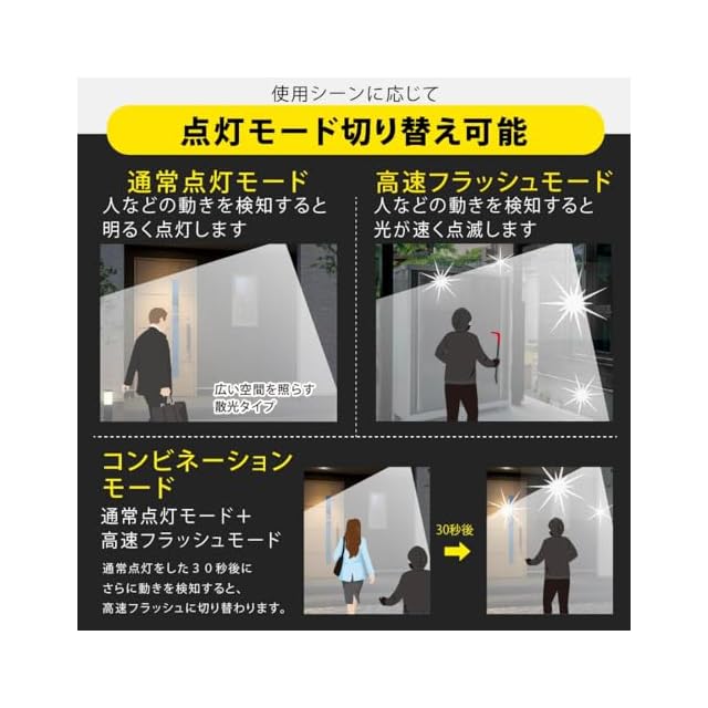 【4つの点灯モード】 ①常時点灯モード…常時点灯します②通常点灯モード…人などの動きを検知すると明るく点灯します(点灯時間は約5秒~5分に調節可能)③高速フラッシュモード…人などの動きを検知すると光が速く点滅します④コンビネーションモード(通常点灯モード+高速フラッシュモード)…通常点灯をした30秒後にさらに動きを検知すると、高速フラッシュモードに切り替わります。