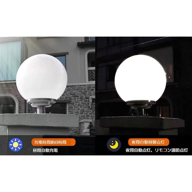 ★ 【商品仕様】直径25㎝ボール内蔵:単結晶ソーラーパネル、リチウムイオン18650充電池3.7V/2000mAh充電池、ホワイト色・電球色LED、防水:IP66、付属品:リモコン·(AAA単4形乾電池×2個)、取付けパーツ(ネジ、プラグ)質量:約795g、材質:PMMA、ステンレス