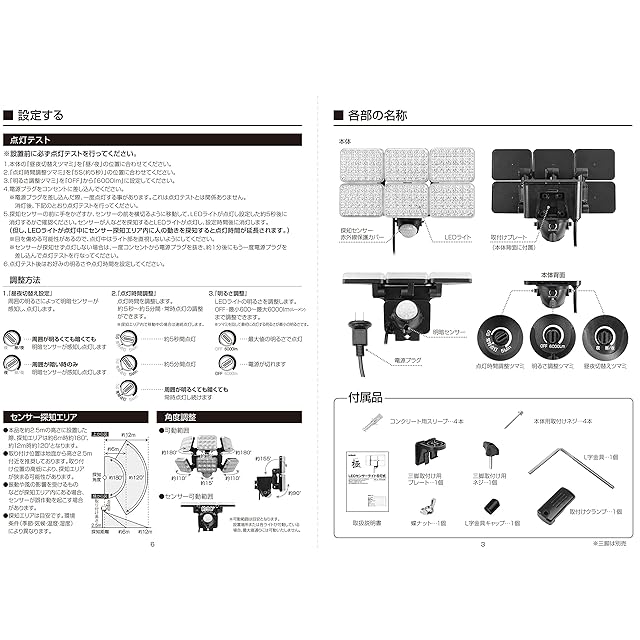 DAISHIN DLA-10T600 センサーライト 6000ルーメン 6灯式 100v コンセント ac 100v 調整 調光 駐車場 賃貸 業務用 調整 取付ブラケット 配管 電池 電池式 停電 威嚇 内玄関 屋外 人感 屋外 防水 明るい 壁 強力 暗くなると点灯