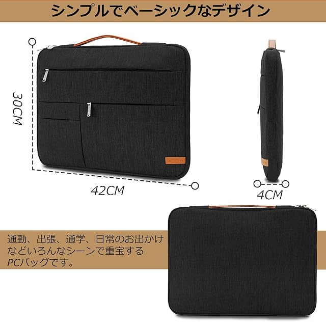 ★【実用的なデザイン】パソコン カバンのデザインはシンプルですが収納が充実してる。バッグ外側に3つのポケットも付き、携帯電話、充電器、イヤホン、ケーブルやノートブックなどの小物をもしっかり整理整頓でき、外出先でも安心です。バッグには手揚げ付いてから、持ち運びに便利です。男女問わず幅広い年齢層でご使用いただけます。