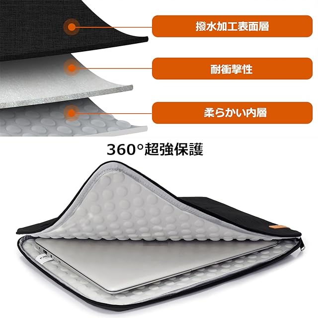 【全面保護】外部からの衝撃を吸収する厚みを保ちながら、体積を少なくして軽量化を実現しています。パソコンケース表面は撥水性に優れ、耐久性と高級感のあるオックスフォード布を採用しております。pcケースの内部が柔らかいフォームパッドで覆われていて、厚いクッション材が入っております。不意な落下や衝撃を吸収し、ラップトップが傷つかないように保護します。