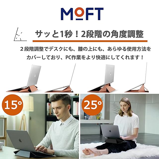 【活用の場は実に様々】オフィス/出張時/通学時/外出時に色々なシーンで活躍。2段階調整でデスクにも、膝の上にも、あらゆる使用方法をカバーしており、PC作業をより快適にしてくれます!リモートワーク中のオンライン会議を25度にすると、カメラ目線が高くなり、映りもよくなりますよ!スタンドを外付けするのではなく、保護ケースそのものがスタンドになる独自設計は薄さわずか7㎜ながら2段階の角度調節にも対応しております。デザイン、機能面で一切の妥協をせずに1つに融合しました。