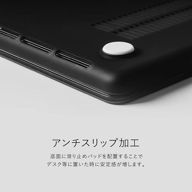 【製品特徴】… ◆ 背面アップルマーク : 見えない ◆ キーボードカバー : なし ◆ 底面滑り止めパッド : あり ◆ 排熱ホール : あり ◆ 装着したままケーブル接続 : 可能