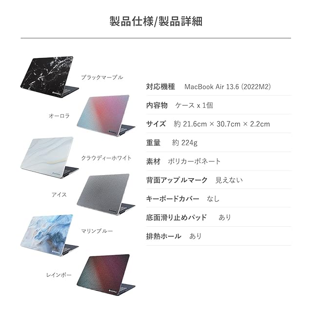 【製品仕様】… ◆ 対応機種 : Apple MacBookAir 13.6 2025 M4 2024 M3 2022 M2 ( マックブック エアー 13.6インチ ) ◆ 内容物 : ケース × 1個 ◆ サイズ : 約 21.6cm × 30.7cm × 2.2cm ◆ 重量 : 約 224g ◆ 素材 : ポリカーボネート