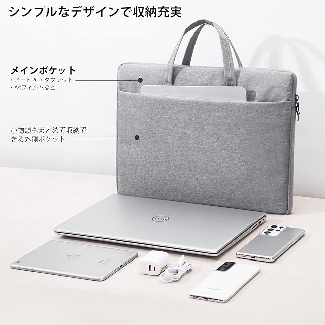 【収納スペースが豊富】14.1-15インチ対応のパソコン収納ケースで、メインポケットにはパソコンがすっぽり入り、大きなフロントポケットが設けられ、タブレットやマウス、スマホ、折り畳み傘などの小物が収納できます。ビジネスリュックなどに入れて持ち運ぶ場合でも、鞄の中からスムーズに取り出しやすいのは、持ち手がついています。