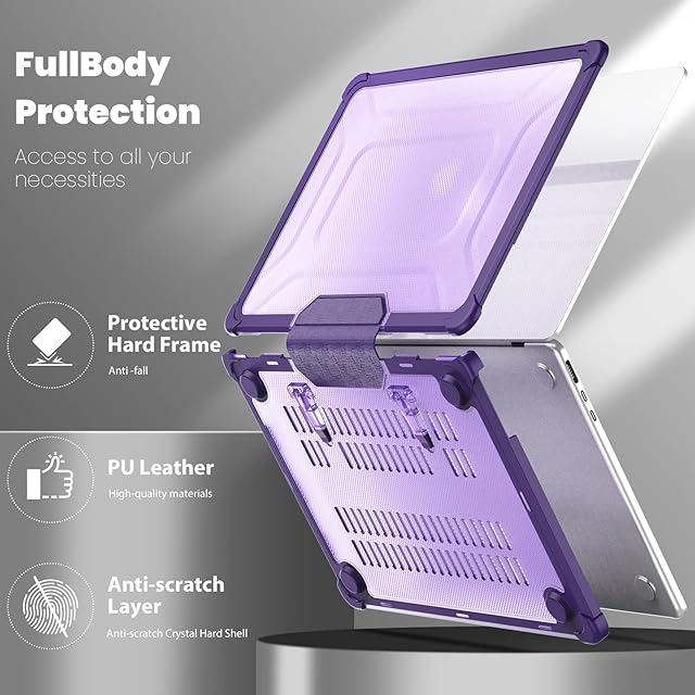 Batianda 対応15 インチ MacBook Air (M3) 2024 2023 M2発売にした頑丈な保護ケース-全防護衝突防止設計折りたたみ式スタンド-耐久耐スクラッチ防止、キーボードフィルム+スクリーン保護フィルム付き、パープル