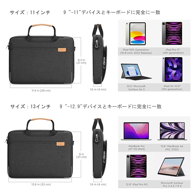 【寸法と互換性】外部寸法:32 x 23 x 4 cm / 12.5 x 9 x 1.6 インチ(長さx幅x高さ)、内部寸法:31 x 22 x 2.5 cm / 12 x 8.7 x 1 インチ(長さx幅x高さ);メインコンパートメント内ポケット:21.5 x 30.5 x 1.5 cm / 8.5 x 12 x 0.6 インチ、12.9 インチiPad Pro 2018-2022 M1 M2、13 インチMacbook Air 2018-2022 M2 M1、13 インチMacBook Pro 2016-2022 M2 M1、Surface Pro 3 4 6 7 8 9 X、Surface Laptop Go 2、13.3 インチ13.4 インチDell XPS 13 Plusに対応しています。