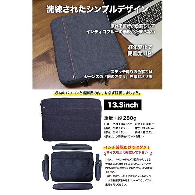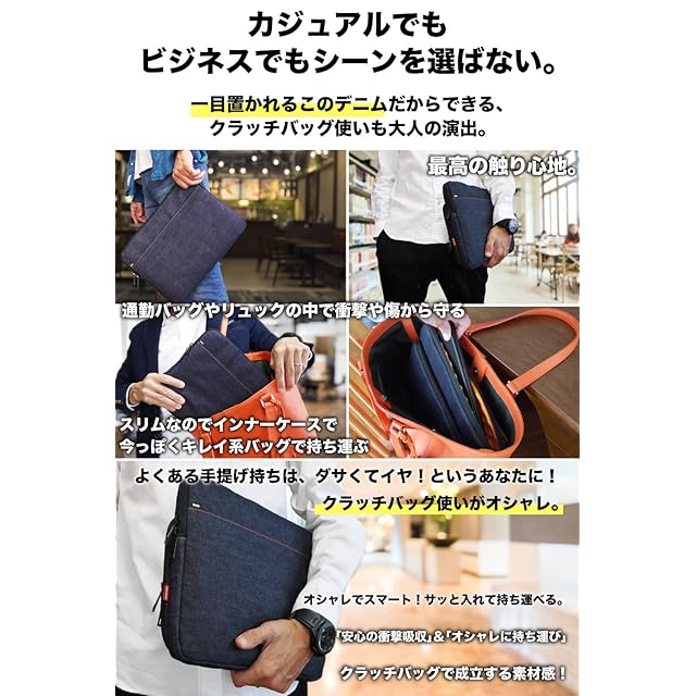 【デニム好きには、たまらない】あなただけの色落ちを楽しむ。ノートパソコンケースがクラッチバッグ使いもできる大人の演出。注目を浴びる日本製デニムから「昔ながらの製法」のセルビッチデニムを使用で手触り最高。通勤バッグやリュックなどカバンの中で衝撃や傷から守る。スリムなのでインナーケース で、おしゃれに今っぽくトートバッグに入れて持ち運ぶのがおすすめ。通勤 通学 出張 旅行のあらゆるシーンでメンズ、レディーズを選ばす使えます。安心の衝撃吸収性にすぐれたPCケースで余計なモノを省いた設計。なのに3つの収納ポケットで大容量。マウスやコードをはじめ、携帯、充電器、ケーブル、ハブ、AirPodsなどのPCアクセサリーが丸ごと収納できるのも人気の秘訣。中の素材も万が一の衝撃からしっかり守る、素材と形状。パソコンの四角も安心。正面ポケットには、ipadなどのタブレットもサッと取り出せて便利。