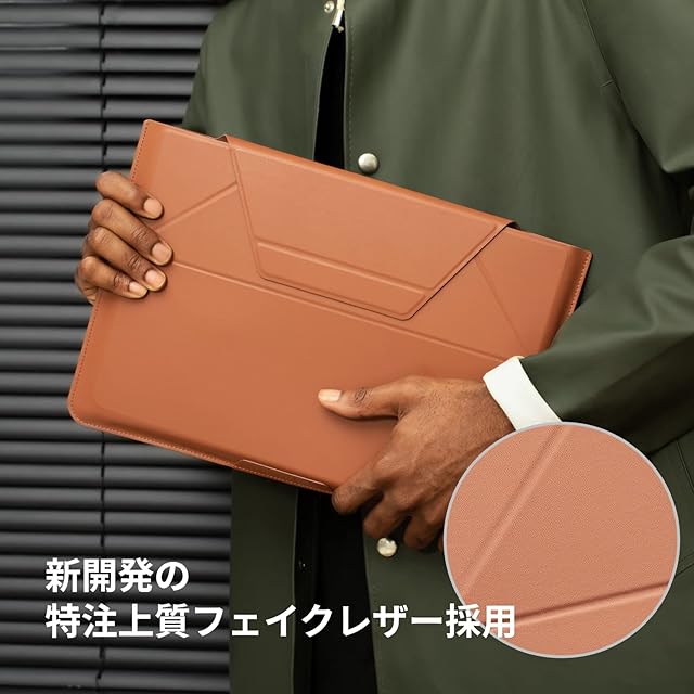 【特注上質フェイクレザーを採用】従来のフェイクレザーより約30%薄く、生地の表情がより繊細になっています。さらに、耐久性にも優れており、温かく柔らかい手触りでより持ちやすくなっています。突然の雨やうっかり飲み物をこぼしてしまった時に大事なノートPCを守る撥水機能も備えています。