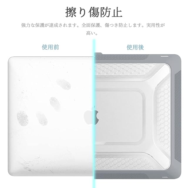 【高級なPC+TPU材質】表面は硬いPCを使用、手触りが良い、高級感ある。味がなくて、クリア、それに、耐衝撃、防水などの機能も持っています。四隅で落下の衝撃を緩和するために柔軟なシリコン素材を使用しており、MacBook Pro へのダメージを軽減します。柔軟に変形しない、手触りを防ぎ、指紋の汗を防ぎ。超質感、手触りが一番、外観は一流です。