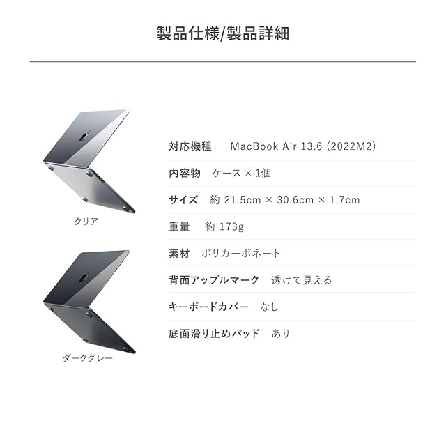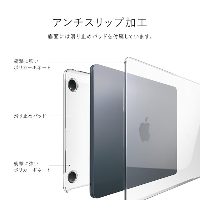 【製品特徴】… ◆ 背面アップルマーク : 透けて見える ◆ キーボードカバー : なし ◆ 底面滑り止めパッド : あり