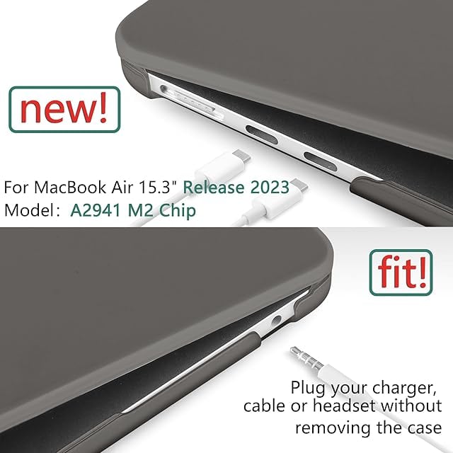 ケースは最新のMacBook Air 15.3インチ(対角線)Model A2941 2023年6月にリリースされたM2チップに対応しています。注意:機種によって異なるケースに対応しているので、注文前に機種をよくチェックしてください。