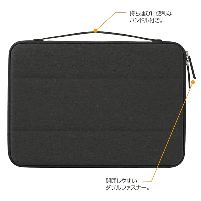 開閉しやすいダブルファスナー、持ち運びに便利なハンドル、落下防止ゴムバンド付き