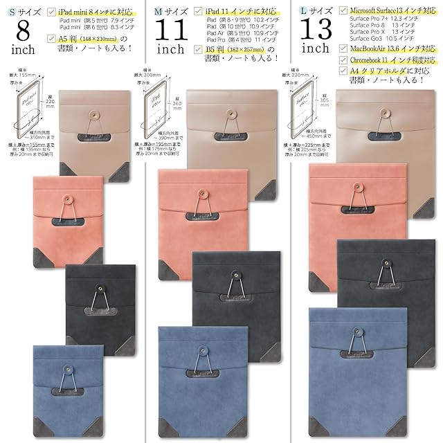 レトロなマルタック留め具がポイントの、シンプルで温かみのある薄型ドキュメントケース風デザイン。便利なイヤホンポケット&スタイラスペンホルダー付きのタブレット&ノ-トPC用ケース。全4色、サイズは3種類。 《マトッテ・タブレ Lサイズ》 ☑Microsoft Surface13インチ対応 MacBookAir 13.6インチ対応 ☑Chromebook 11インチ程度対応 ☑A4クリアホルダに対応。書類・ノートも入る! 【対応デバイスサイズ】 ◎横方向 最大220mm 横方向の外周((横+厚み)×2)は450mmまで可能 ※注 ◎縦方向 最大305mm ◎厚み ※注 ※注:横方向の対応寸法はデバイスの厚みにより異なります。 横+厚みが225mm(横方向の外周は450mmまで)まで収納可能です。 例)横205mmなら厚み20mmのデバイスまで可