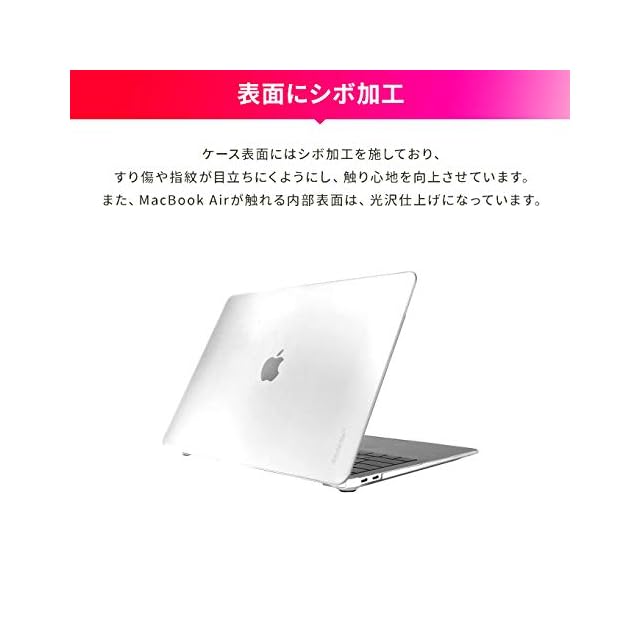 【傷に強いコーティング】… ケース表面にはシボ加工を施しており、すり傷や指紋が目立ちにくようにし、触り心地を向上させています。MacBook Airが触れる内部表面は、光沢仕上げになっています。