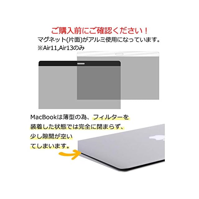 【MS factory(R) 正規品】 MacBook マグネット式 のぞき見防止フィルター<br><br> <b>< 対応機種 ></b><br> ・MacBook Pro 13インチ Discスロット搭載 ( Mid 2010年モデル~ 2012年モデル ) モデル番号:A1278 ※Mid 2009を除く<br> ・MacBook Pro 13インチ Retina displayモデル ( 2012年モデル~2015年モデル ) モデル番号:A1425 A1502 <br> ※上記モデル以外のMacBook Pro13インチには対応していませんのでご注意ください。<br><br> <b>< サイズ ></b><br> 約 307mm×202mm 厚み:約0.6mm<br><br> <b>< のぞき見防止フィルター特徴 ></b><br> ◆簡単着脱:取り付けはマグネット式なので、外出先で必要な時だけ取り付け・必要のない時はすぐに取り外し可能。<br> (フィルム上部に内蔵されたマグネットにより取り外しができます。両面使用可)<br> ◆リバーシブル:光沢のあるグロス面と、反射防止のアンチグレア面(マット加工/防指紋)の両面使用可能なのでお好みや使用環境によって使い分け可能です。<br> ◆素材:日本製PET/日本製プライバシーフィルター/磁石<br> ◆視野角度:60度(左右各30度) 隣の席から覗き見防止できるのでプライバシーが守れます<br> ◆硬度:3H 傷がつきにくい<br> ◆透過率:58%<br> ◆ブルーライト:35%カット<br><br> <b>< 注意事項 ></b><br> 厚みのあるフィルターとなりますので、このフィルターを<b>液晶画面に装着したままではMacBookは完全には閉じません。</b><br> MacBookを閉じる際はフィルターを取り外してのご使用をお薦めします。<br>
