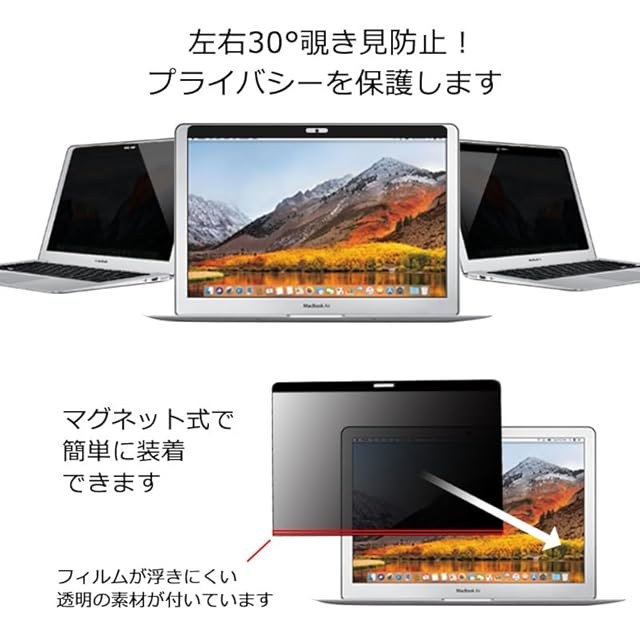 【MS factory(R) 正規品】 MacBook マグネット式 のぞき見防止フィルター<br><br> <b>< 対応機種 ></b><br> Pro13<br> ・ MacBook Pro 13インチ M2チップ Touch Bar 搭載 2022年モデル ( モデル番号: A2338 )<br> ・ MacBook Pro 13インチ M1チップ Touch Bar 搭載 2020年モデル ( モデル番号: A2338 )<br> ・ MacBook Pro 13インチ Touch Bar搭載 2020年モデル ( モデル番号: A2251 A2289 )<br> ・ MacBook Pro 13インチ Touch Bar搭載 2019年モデル 2018年モデル ( モデル番号: A2159 A1989 )<br> ・ MacBook Pro 13インチ Touch Bar搭載 2017年モデル 2016年モデル ( モデル番号: A1706 )<br> ・ MacBook Pro 13インチ Touch Bar非搭載 2017年モデル 2016年モデル ( モデル番号: A1708 )<br> ※上記モデル以外のMacBook Pro13インチには対応していませんのでご注意ください。<br> Air13<br> ・ MacBook Air13 インチ Retinaディスプレイ M1チップ Touch ID 搭載 2020年モデル ( モデル番号: A2337 )<br> ・ MacBook Air13 インチ Retinaディスプレイ Touch ID 搭載 2020年モデル ( モデル番号: A2179 )<br> ・ MacBook Air13 インチ Retinaディスプレイ Touch ID 搭載 2019年モデル 2018年モデル ( モデル番号: A1932 )<br> ※上記モデル以外のMacBook Air13インチには対応しておりませんのでご注意ください。<br><br> <b>< サイズ ></b><br> 約 300mm×195mm 厚み:約0.6mm<br><br> <b>< のぞき見防止フィルター特徴 ></b><br> ◆ブルーライトカット:液晶からのブルーライトを約30%カットします。<br> ◆透過率:65% 覗き見を防止しながら、画面が見やすい明るさを保つ透過率です。<br> ◆モアレ防止加工:覗き見防止フィルムに発生しやすいモアレ(縞模様や波状のような線)が発生しにくいモアレ防止加工を施しています。<br> ◆簡単着脱:取り付けはマグネット式でワンタッチなので、外出先で必要な時だけ取り付け・必要のない時はすぐに取り外し可能。<br> (フィルター上部に内蔵されたマグネットにより取り外しができます。)<br> (片面のみ使用可。装着した時にインカメラがカメラ穴に対し左側に来るように装着してください。)<br> ◆仕様:光沢のある指紋が付きにくい反射面がおもて面です。<br> ◆素材:日本製PET/日本製プライバシーフィルター/磁石<br> ◆視野角度:60度(左右各30度) 隣の席からの覗き見防止できるのでプライバシーが守れます<br> ◆硬度:3H 傷がつきにくい<br> <br> <b>< 注意事項 ></b><br> 厚みのあるフィルターとなりますので、このフィルターを<b>液晶画面に装着したままではMacBookは完全には閉じません。</b><br> MacBookを閉じる際はフィルターを取り外してのご使用をお薦めします。<br>