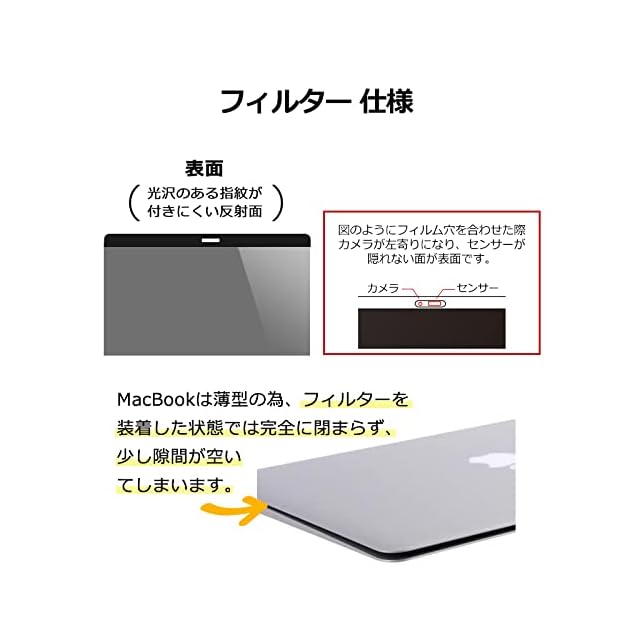 < 注意事項 >厚みのあるフィルターとなりますので、このフィルターを液晶画面に装着したままではMacBookは完全には閉じません。MacBookを閉じる際はフィルターを取り外してのご使用をお薦めします。片面のみ使用可。装着した時にインカメラがカメラ穴に対し左側に来るように装着してください。