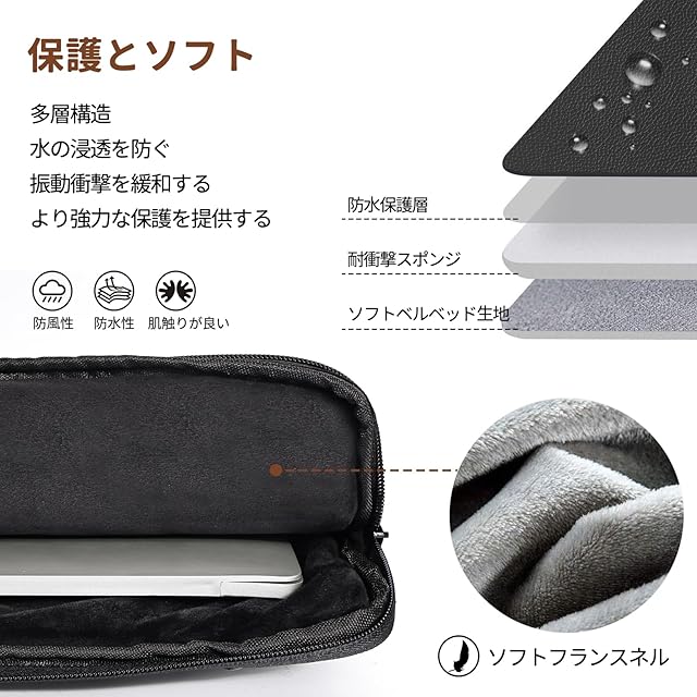 【360°全方位保護】:パソコンケース内部の厚くてふわふわしたクッションは衝撃吸収効果に優れています。 ジッパーの周りに保護パッドも付いており、傷を防止し、大切なノートパソコンを保護します。 耐水性のある生地は見た目以上に耐水性があります。 多少の汚れがついても拭くだけで簡単に取れます。 雨や雪からの水が浸入せず、大切なノートパソコンや周辺機器を濡れから守ります。