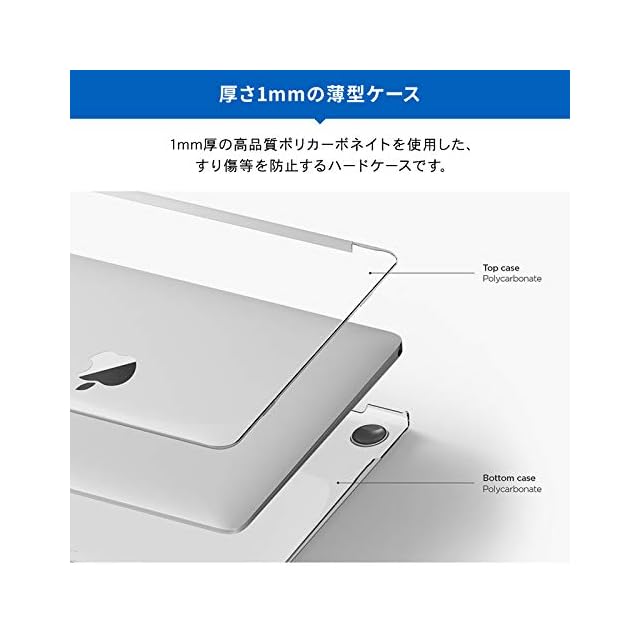 【高透明度のクリアケース】… 高透明度のクリアポリカーボネイトを使用した、フルカバーハードケースです。Macbook本来のデザインを損なわなず、擦り傷や汚れを防止します。