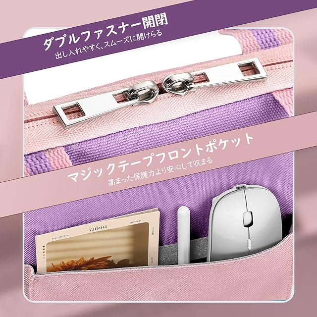 「出し入れやすく取り扱い簡単」 収納バッグ全体適度な厚みがありながら、体積を少なくして軽量化を実現した仕上がりになっており、メインポケットはデバイス収納の出し入れに便利でスムーズに開け閉めできるダブルファスナー仕様を採用し、防水性と安全性が高まり、スムーズに開けられるので、忙しいときにノートパソコンを素早く出し入れも対応できます。