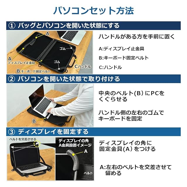 【ケースに入れたまま使えるPCバッグ】 ノートPCや大型タブレットを入れたまま使用できるPCバッグ。 電車や車、バスなどの移動中にも便利です。手提げ・ショルダーの2WAY仕様。 ・意匠権取得商品 ・意匠登録 第1776275号 ・バッグ型ノートPCホルダーが世界初のデザインとして認められました 【肩掛けベルト付で立ったまま作業できる】 バッグの4か所にフックを取り付けることで、簡単に着脱できる肩掛けベルトをご利用いただけます。持ち運び時にはショルダーバッグとしても使用できます。 【頑丈な3層構造】ポリウレタン・EVA・裏地の丈夫な三層構造。外側は頑丈な耐水素材で、突然の雨や落下から大切なコンピューターを守ります。 【様々なシーンで活躍!】 立ったままタイピングしたり、ハンズフリーで作業できるため、倉庫や現場での作業に便利です。 【製品仕様】外部サイズ:縦27.5×横39cm マチ3.3cm 対角線43cm 内部サイズ:縦25.5×横36cm マチ2.6cm 対角線42cm ベルト長さ:104~120cm バッグ重量:503g 材質:EVA・ポリウレタン 耐荷重:3kg 適合サイズ:14インチもしくは14インチ以下のノートPC 生産国:中国 ・意匠権取得商品 ・意匠登録 第1776275号 ・バッグ型ノートPCホルダーが世界初のデザインとして認められました ご使用上の注意 ①乾拭き、水拭きを行ってください。水分が残ると加水分解が生じる恐れがあるため、水拭きの場合は十分に乾燥させてください。 ②溶剤、漂白剤は使用しないでください。表面の損傷・ツヤ変化・溶解・色柄落ち・硬化や軟化・剥離などが生じることがあります。 ③本皮、塩化ビニル素材と接触させると、色移りが生じることがありますので、ご注意ください。