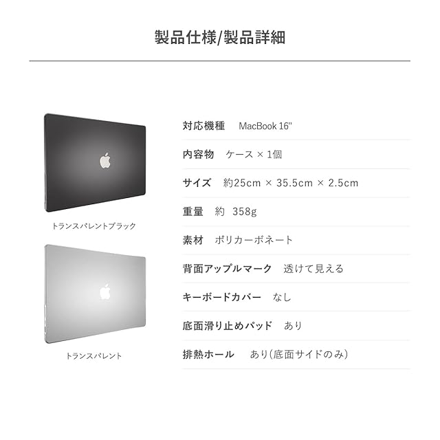 【製品特徴】… ◆ 背面アップルマーク : 透けて見える ◆ キーボードカバー : なし ◆ 底面滑り止めパッド : あり ◆ 排熱ホール : あり(底面サイドのみ) ◆ ご注意:MacBook Pro (M3 Pro, M3 Max) には対応していません。