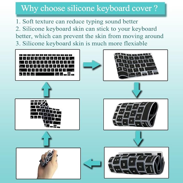 高品質のソフトシリコン素材で作られており、滑らかな手触りと厚さ0.006インチ/0.15mmです。 タイピング時のタイピング音を低減できます。 ノートパソコンの開閉に影響を与えません。キーボードのバックライトは黒いキーボードカバーを通過できません。