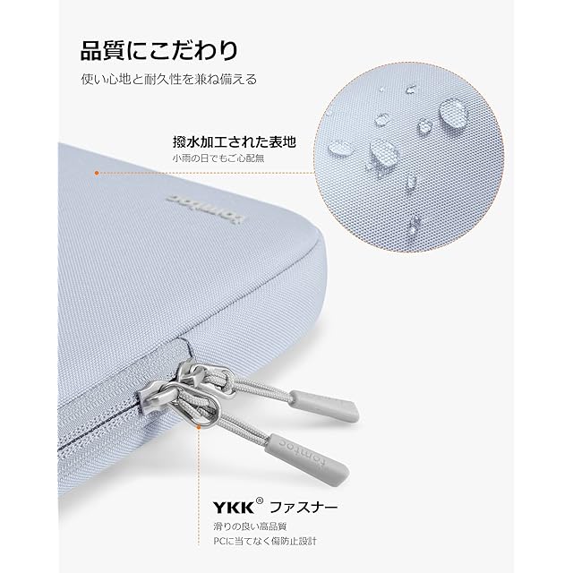 高品質の撥水加工されてエコ材表地、安心のYKK製両開きファスナー、裏生地の洗練されたライン模様、及びしっかりとした作りでMacBook用ケースの最高レベル達成。環境保護の責任を役たすために、このパソコンケースはプラスチックの再生材表地を使用することにより、何十万の廃棄ペットボトルをリサイクルして利用しました。tomtoc製品は全て12ヶ月間安心付きます。