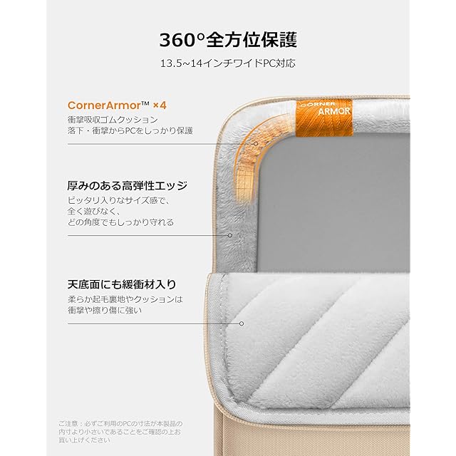商品名:tomtoc 360°保護 13.5-14インチ パソコンケース Surface NEC Lavie Dell HP Lenovo 富士通 Dynabook Asus Chrombook ワイドPC対応 スリーブ ノートPCケース インナーバッグ 耐衝撃 撥水加工 軽量 サンド