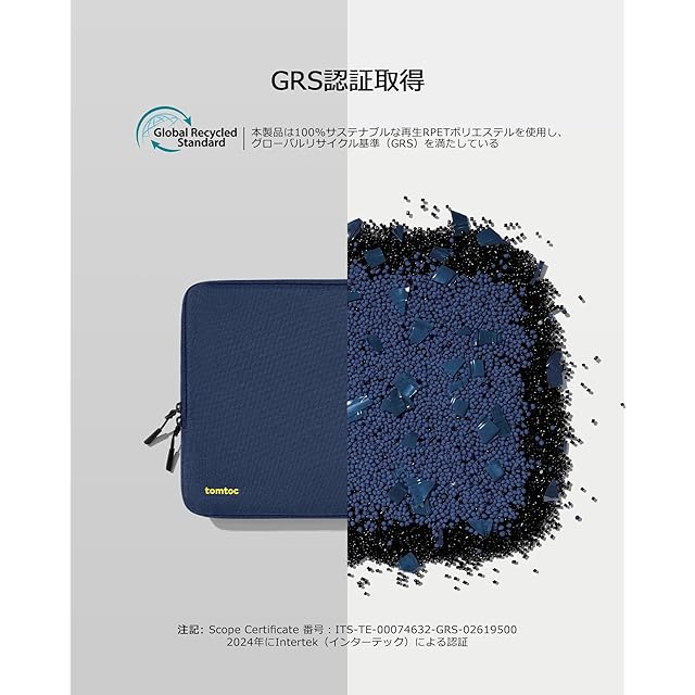 【サステナビリティと品質の融合】 GRS認証(グローバル・リサイクル・スタンダード)を取得したこのノートパソコンケースは、環境に優しい素材と優れたクラフトマンシップを兼ね備えています。撥水加工されたリサイクル生地を使用し、安心のYKKジッパーと柔らかな裏生地が特徴です。何百万本もの廃棄されたプラスチックボトルを再利用して、耐久性と高い機能性を実現したデザインです。tomtoc製品は全て12ヶ月間安心付きます。
