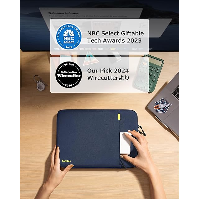 【メディアやお客様からの評判】想像以上の保護力や優れた品質、ピッタリフィットな装着感で、このPCケースは広く高評価されています。Wirecutterより「一番人気のノートパソコンスリーブ ・MacBook Proケース」と褒賞され、さらにNBC Selectより「Select Giftable Tech Awards 2023」を授賞されました。注:Wirecutter :「The New York Times」所属ガジェットレビューメディア。